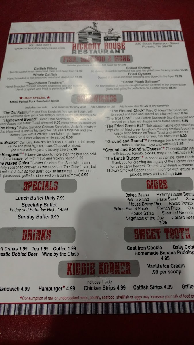 Welcome to Hickory House Restaurant - Pulaski, a culinary treasure located at 330 S Patterson St, Pulaski, TN. This inviting eatery is renowned for its exceptional Southern comfort food, serving dishes that evoke memories of home-cooked meals. The menu features a variety of highlights, including the mouthwatering Mama Q's Filet, tender brisket, and succulent pulled pork plates. Diners rave about the taste of the Kansas City strip steak, described as one of the best they've ever had.